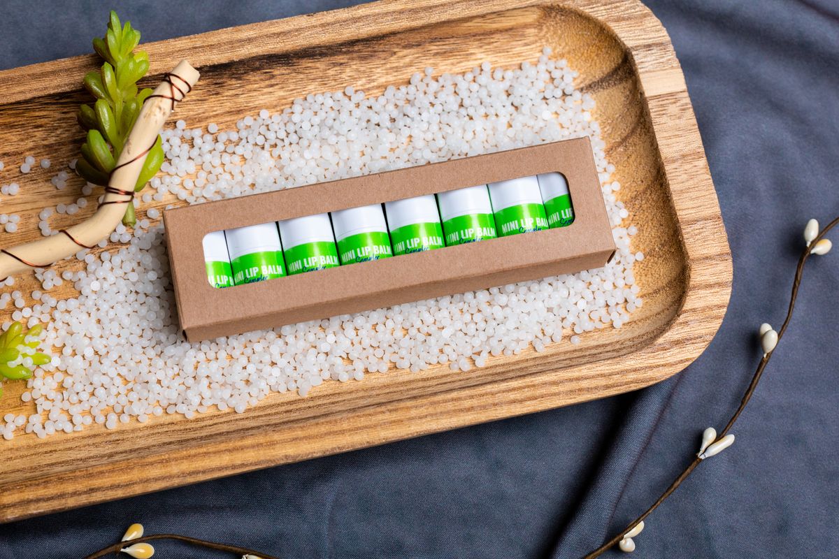 The Mini Lip Balm Set is a lip balm lover's dream! This sampler pack includes your choice of eight flavors of our Mini Lip Balm for a delightful mix of best-selling favorites. Delicately displayed in a brown kraft box or white organza bag, this budget-friendly kit delivers a retail experience without sacrificing quality. **Product is Made in the USA with responsibly sourced, global ingredients.**